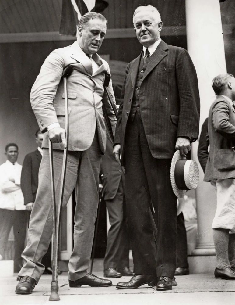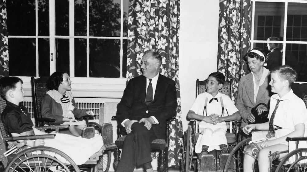 很多年青读者可能完全不知此疾病,可在上世纪20至50-60年代它可是全球盛行的、可怕而猖獗的疾病,由脊髓灰质炎病毒引发的严重危害人类健康的急性传染病。感染后可在数小时内引起肢体不对称弛缓性麻痹,腿和胳膊骨骼会弯曲无力,肌肉软弱无力,只能用拐杖来帮助行走,并留下瘫痪后遗症,无药可救。患者多为1至6岁儿童,可FDR却在壮年时期患上了这种病,致使他下半身肌肉致残,失去了行走与身体直立的能力,永远无法完全恢复双腿的功能。他只有穿上十多磅沉重的支架才能直立,用拐杖支撑,步行几步。绝大多数时间则穿稍轻点的支架坐在轮椅上。