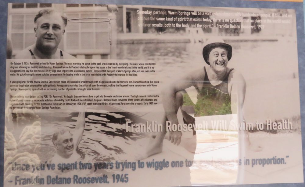 生病后的最初七年,FDR 不得不停下政治追求,开始了艰苦而痛苦的康复治疗。在手杖、腿部支架、轮椅和助手的帮助下,他确实恢复了一些失去的活动能力,甚至学会了用臀部向前摆动萎缩的双腿来“走路” . 1924年10月,即生病后的第三年一位挚友,George Foster Peabody向他推荐温泉水疗法,并介绍了一位因polio 致疾的小男孩,通过温泉水疗得到康复,抛去了手杖、轮椅,恢复了一些身体功能。这给FDR带来了希望。他立即来到了偏远的热温泉小镇。当他在温泉水池中浸泡时,他马上感觉腿部肌肉有舒缓,自得病几年来麻痹了的足趾有动的感觉。 逐渐地感觉浸泡、沐浴和体育锻炼减轻了他的痛苦,信心大增。同时,他也非常喜欢小城与附近的森林,以后每几年多次来这里治疗。