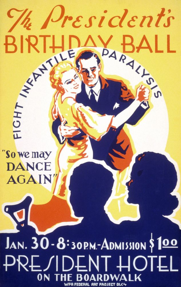 为什么首次“生日舞会”(首次全国性捐赠活动)会有如此大的凝聚力?为什么那些还未完全走出饥饿、流离失所困境的人们会如此解囊,帮助更需要的人?首次舞会之际,FDR就任总统仅仅10个月,大萧条造成的经济崩溃魔爪仍然凶猛地压抑着苦苦挣扎的国家和人民。许多参加并一起庆祝的人们在几个月前还处于极度失业和饥饿状态,但他们通过FDR 就任后以雷励风行的速度,颁布的各项前所未有的新政工作计划,找到了工作和尊严(下节将详细介绍),能够基本维持自己与家人的生活。怀着对FDR的感激和信任,他们着装参加了那些精心准备的生日音乐舞会。不同阶层的人们相聚在一起,充满欢笑和快乐。很多城市和村庄里,许多人还是第一次如此开心地相聚。生日舞会既对那些需要帮助的小儿麻痹症残疾人伸出援助之手,也让参加与者对自己,对国家的前景充满了信心与希望。以后十年,每年的1月30日生日几乎都集资一百万美元左右。