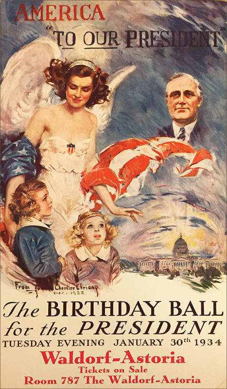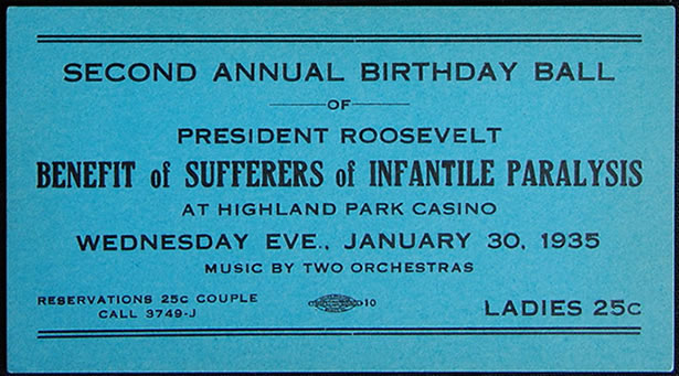 FDR利用他的生日推进了他一生最重要的事业之一,寻找治疗小儿麻痹症的康复和根治方法。他说,“将一个人的生日与这样的目标联系在一起是一件光荣的事。这目标让整个世界变得亲密。因人类苦难所唤起的这种亲情也许是最亲密的,因为那些致力于帮助他人的人同时中也得到真正的精神友谊”。以后十年的 1月30日不再只是FDR个人的生日,而是他和美国大众致力于为小儿麻痹症研究和治疗筹集资金的日子!FDR将多么崇高的精神境界,人类的大爱种植在当时的美国人民心中!