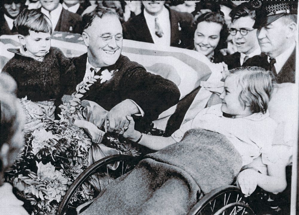 1945年3月FDR最后一次在国会做演讲时,他首次坐着说,“副总统先生,议长先生,各位国会议员们,请你们原谅我以不应该的姿势,坐着做此报告。但我想你们可以理解,因为这样可以减轻我的身体负担,我可以不用带十多磅的铁支架。”