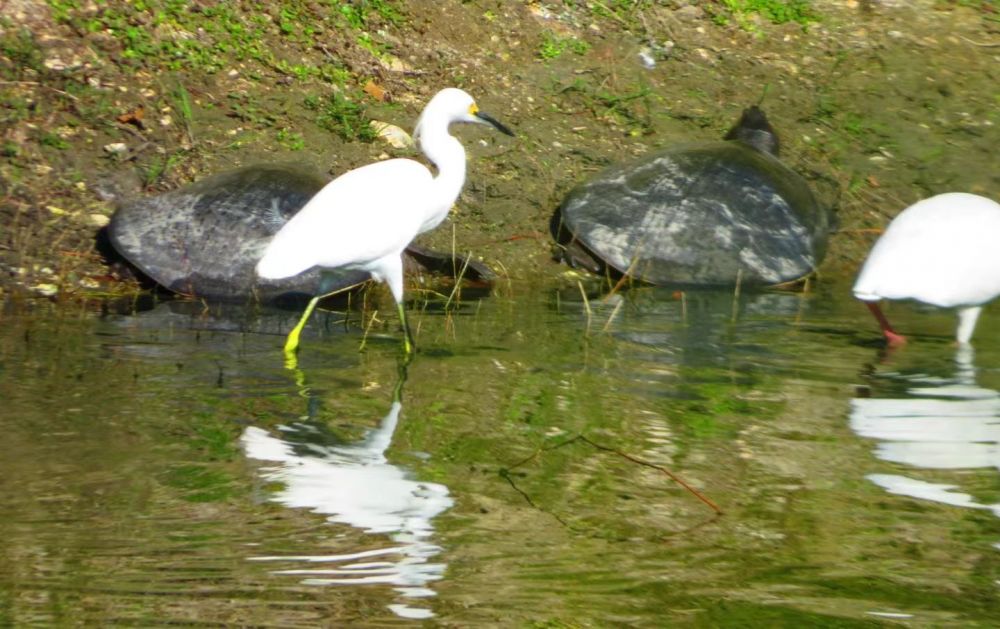 这只小巧玲珑的Snow egret 雪鹭在水中漫步, 完全不理睬塘边的两只大龟。而龟呢,也无惧雪鹭。