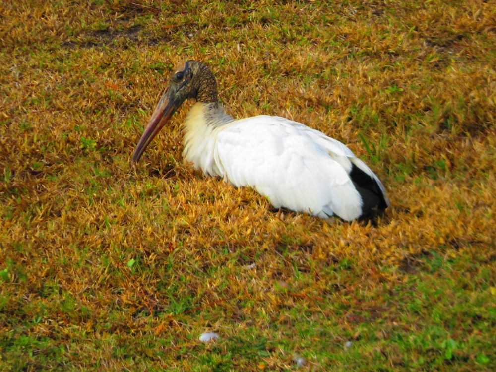 这只大wood stork木鹳不知为啥在塘边高处挖了个小坑, 静静地蹲在那里。查了查可能是冬取暖。