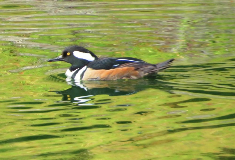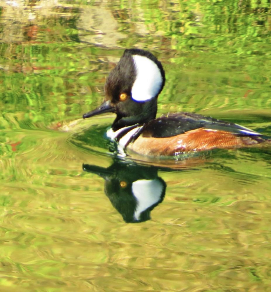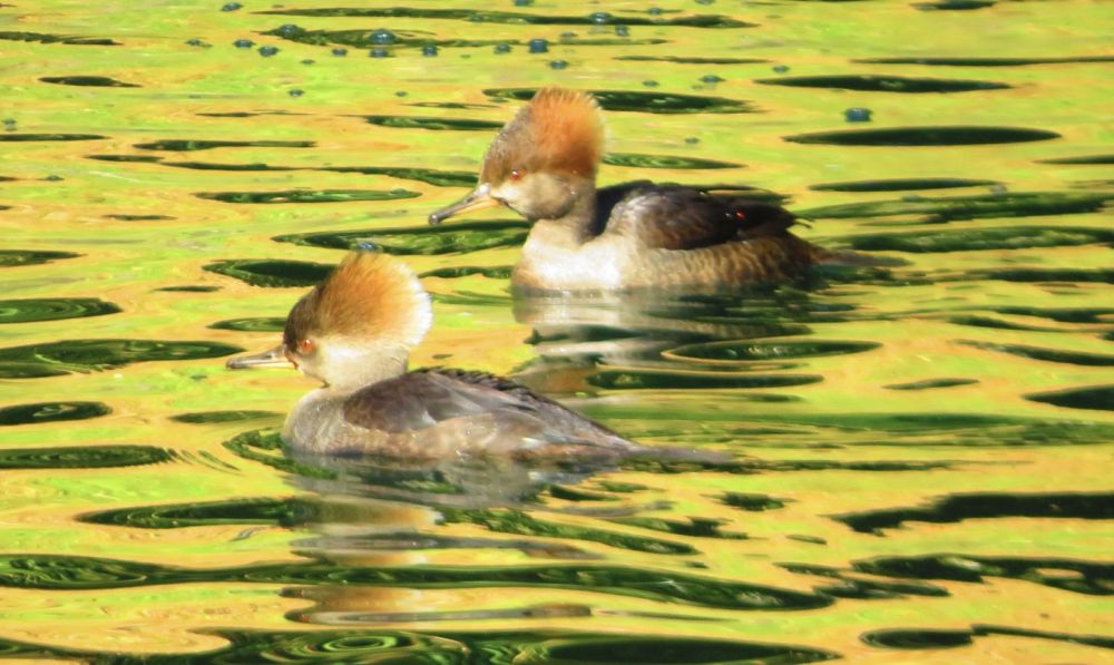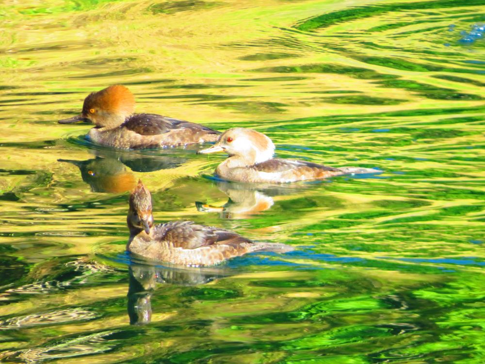 那一大群hooded merganser 镜冠沙秋鸭特显眼,热热闹闹, 游来游去, 不停地钻进水里寻食。