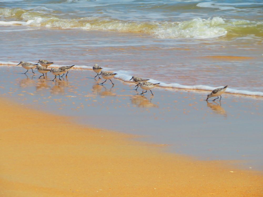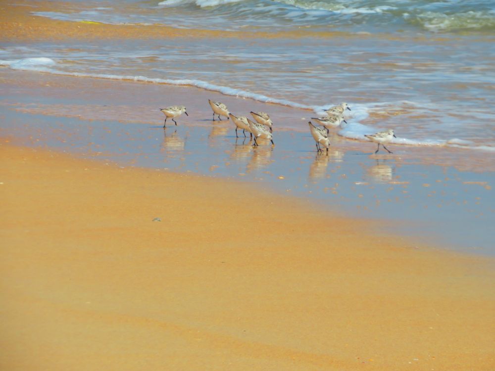 那天,海浪虽不算汹涌,却不紧不慢地一浪追着一浪,反复冲刷着岸边。就在浪花翻卷与潮水退去之间,忽然看见一群小小的鸟儿,在沙滩与海水交界处不停地追逐、穿梭、觅食。我一时竟以为是一群鸟宝宝,不禁脱口而出:“真是初生牛犊不畏虎。” 于是赶紧举起相机,抢拍下了几张。