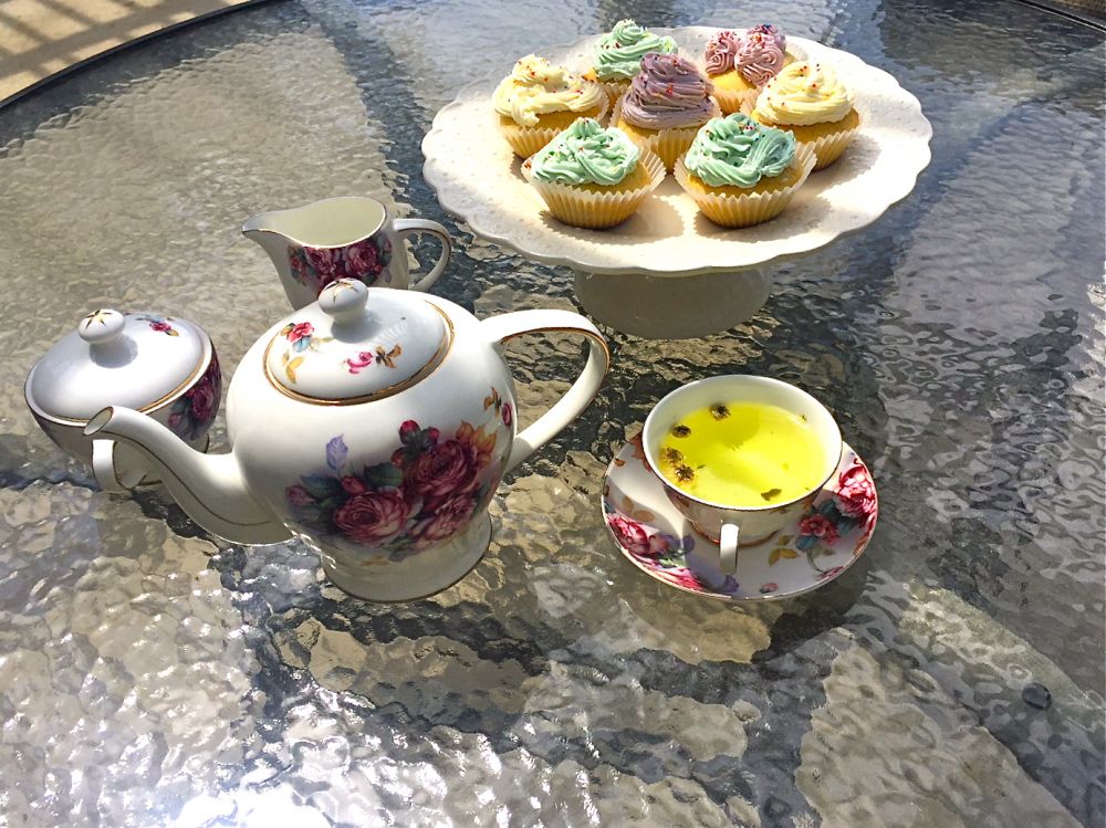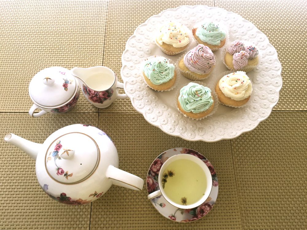 沏了一壶清茶来配我的杯子蛋糕,还拍了照留念。突然发现摆放蛋糕的盘子和整套的骨瓷茶具都是从一个朋友J 那里买来的。