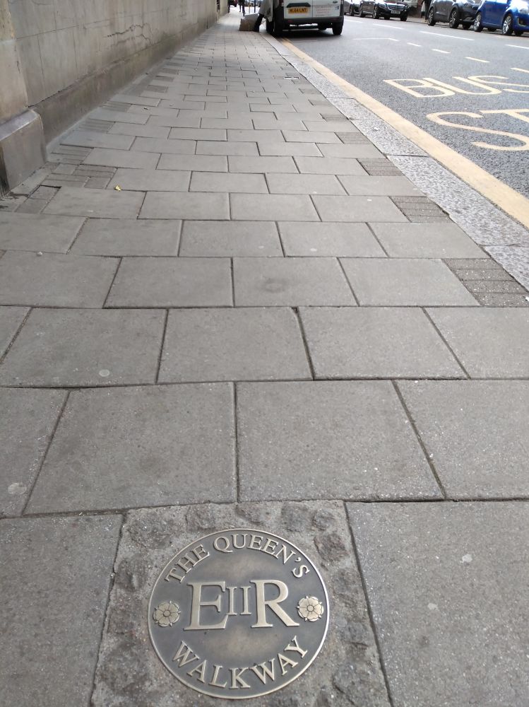 先溜达溜达,看看温莎堡是市容。一看,才知道不仅仅城堡是英国王室的,而且,整个城市都是皇家领地。连人行道都有伊丽莎白二世女王的标记。E 是伊丽莎白,R是拉丁文女王Regina,中间是罗马数字2,这个符号就是伊丽莎白二世女王。