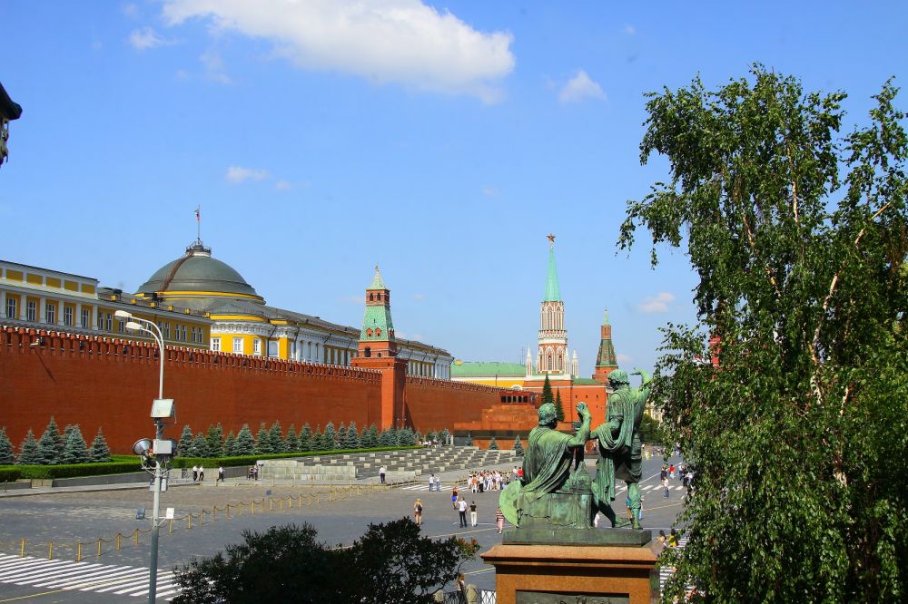 12. 红墙内的圆顶黄墙建筑即为克里姆林宫元老院,俄罗斯总统办公场所。正对列宁墓的元老院塔楼下有一不起眼的小门,非常方便当年在前方列宁墓上方及周围观礼台活动的苏共中央高层的出入。