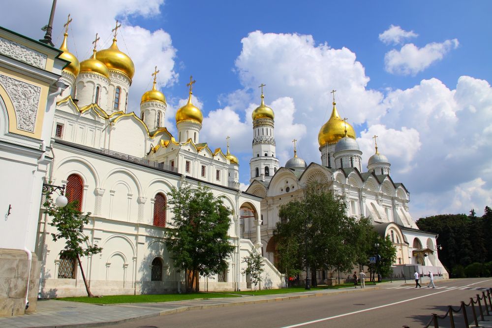 25. 克里姆林宫内教堂广场有三座主教堂-天使长大教堂、圣母升天大教堂和天使报喜大教堂。靠近大克里姆林宫有圣母法衣存放教堂、十二使徒教堂。图中九个金顶(可见8个)教堂是天使报喜教堂,是沙皇的私人教堂。教堂Blagoveshenskiy Cathedral