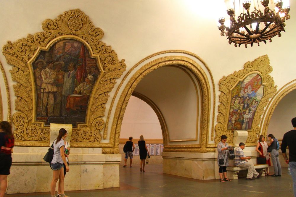 64. 这是地铁3号线革命广场站,开通于1938年,也是五星级的地铁站,站内有许多雕塑,反映了苏联时期社会各界人士,工农商学兵之类。创造灵感来源于米开朗基罗在罗马西斯庭教堂内的天顶壁画《创世纪》,当然米大师笔下的肌肉男都穿上苏联的时代装。