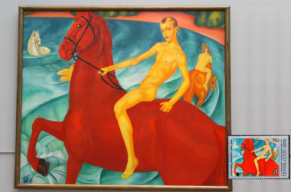80. 除了普希金艺术博物馆外,莫斯科另一处艺术圣殿即特列季亚科夫美术馆Tretyakov Gallery ,该馆新馆中收藏了大量俄罗斯/苏联绘画作品。这幅《浴赤马图》是俄罗斯画家Kuzma Petrov-Vodkin 创作于1912年,1978年曾上过苏联邮票(右)。