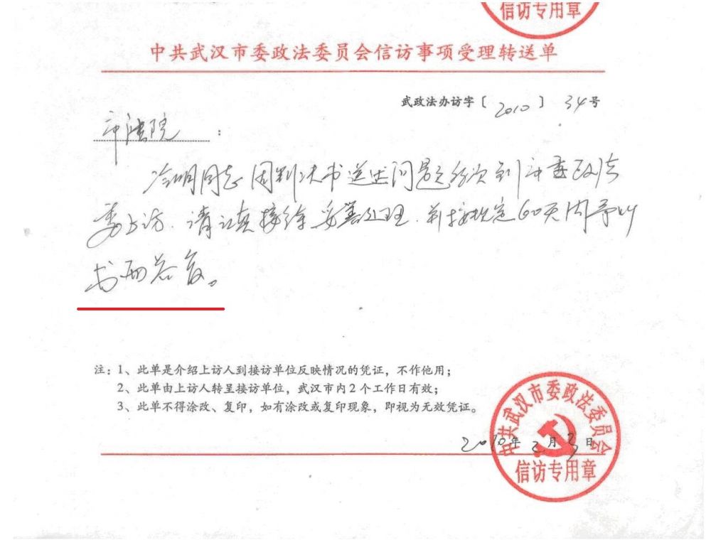 市政法委周一、三、五上午接待。第三天我又赶到市政法委,对领导说:武汉市中级法院法官说他们会按照你们的要求60天后“随便说一下就行了!”所以,我要求领导重新开一份《转送单》,上注明是“书面答复”。这下领导有点动怒了。他要我把原来的一份《转送单》还给他,他在上面加上了“书面”两个字,看了看又觉得不妥,重新又给我开了一份《转送单》,注明“书面答复”。 我拿着这份重新开出的《转送单》的复制件再到中院,交给张捷峰主任,这下他没辙了。