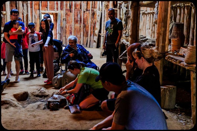 工作人员现场讲解Iroquoian人当时原始的生活,如何取火,如何从枫树的糖水中提炼枫糖浆,以及如何用玉米做玉米饼。