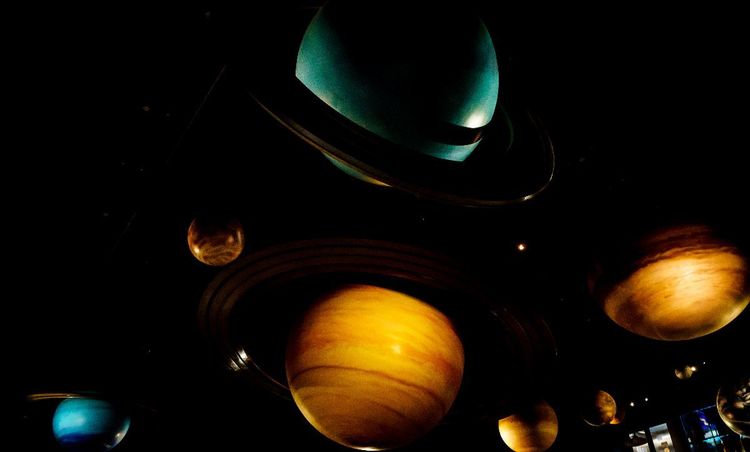 大厅里黑色的天幕下悬挂着几大行星的模型。