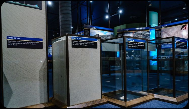 下面这个展览是我迄今为止看到的诠释人类生命短暂最直观的展示。这个展示用一粒沙子代表一年,如果人的平均寿命是75岁,图中这四个大玻璃柜子里面放的沙子数量,从右到左依次为人的寿命(75岁);Signal Hill 从最近的一次被冰川覆盖距今的时间---9000年;恐龙灭绝距今的时间---6千500万年;地球的年龄--45亿年!