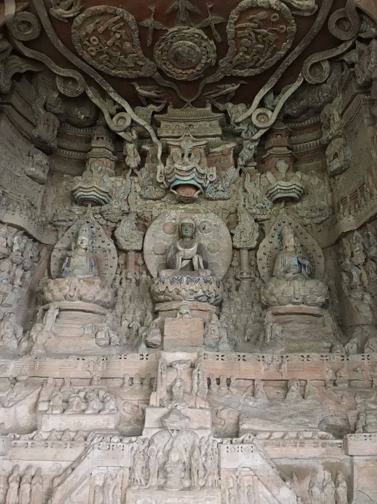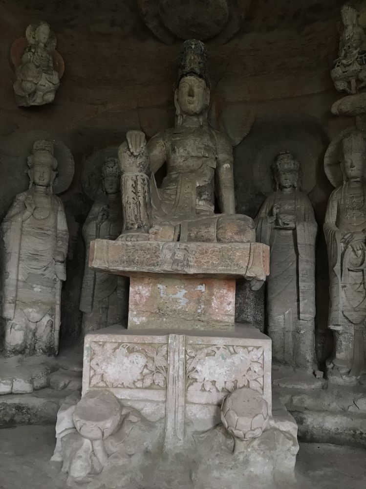 毗卢遮那佛,又称大日如来。洞窟正中以高浮雕的形式刻着一转轮经藏,中间端坐着毗卢遮那佛,手结菩提印,为众弟子讲经说法。佛像嘴边的两道金光代表佛口吐文理之光