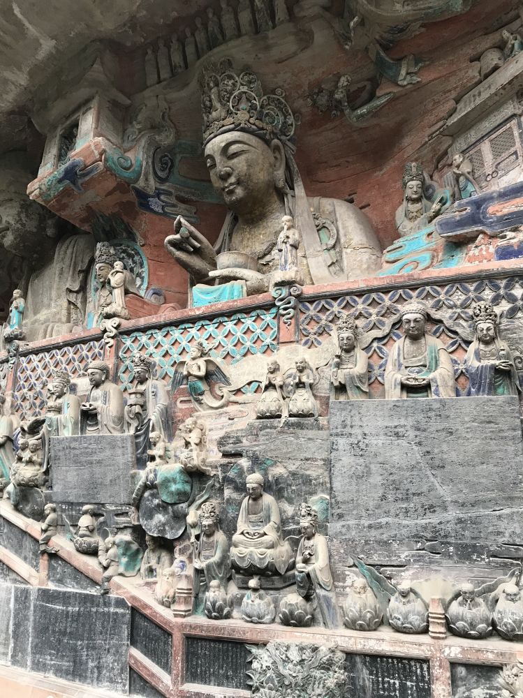 千手观音阁,开凿于南宋年间,观音上方以及左右岩刻千手千眼,如孔雀开屏。2015修复使用了金箔100多万张