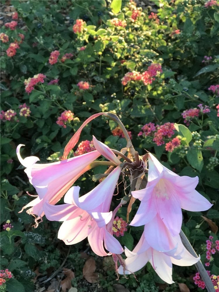 花开无叶为君落朱顶红(华胄兰)2019.8.1.在斯坦福大学的校园里拍到这种花开无叶的植物,花型很像萱草花,萱草花又名“解忧”,其中一种是我们常吃的黄花菜。但是这株植物是粗壮的一根褐红色的茎,顶端并蒂开好几朵花,而且只开花不长叶。于是觉得好奇,赶紧查了一下,此花叫“朱顶红”,又名“华胄兰”,说是先开花再长叶。华胄兰后来在一个三[