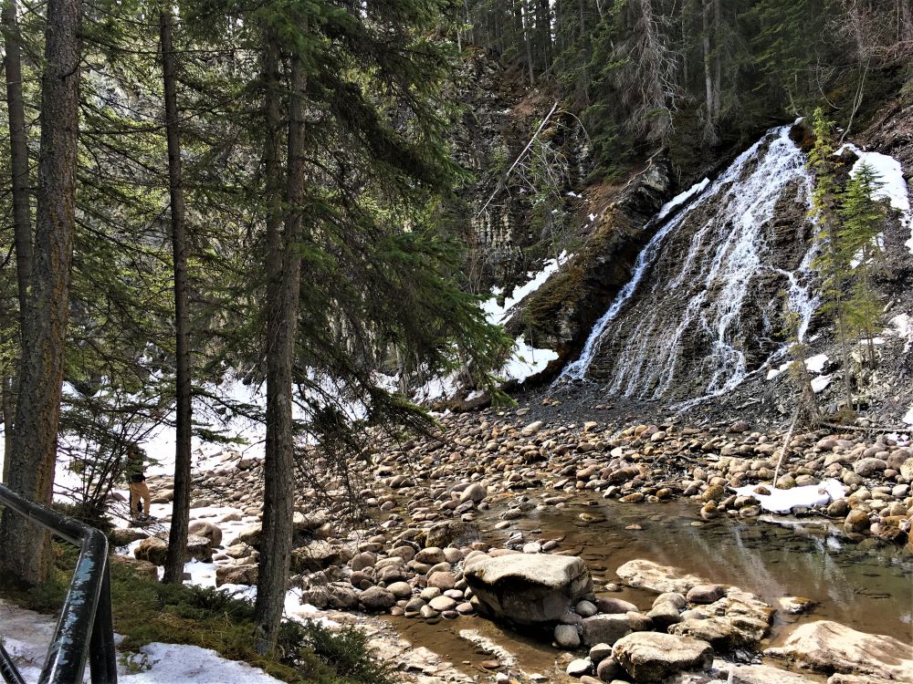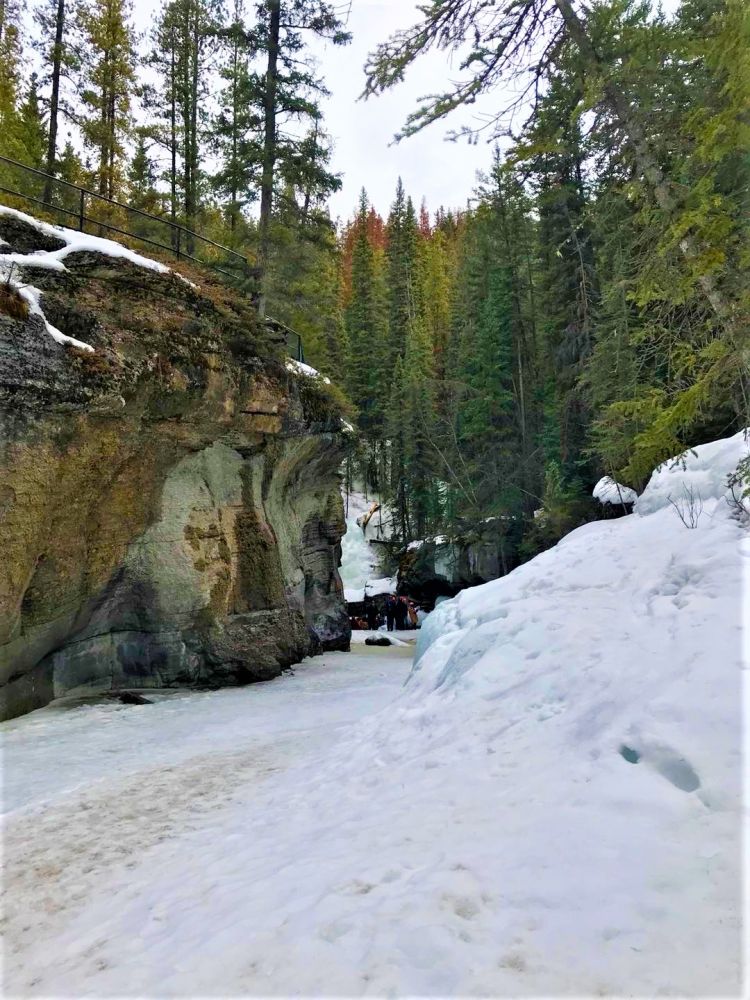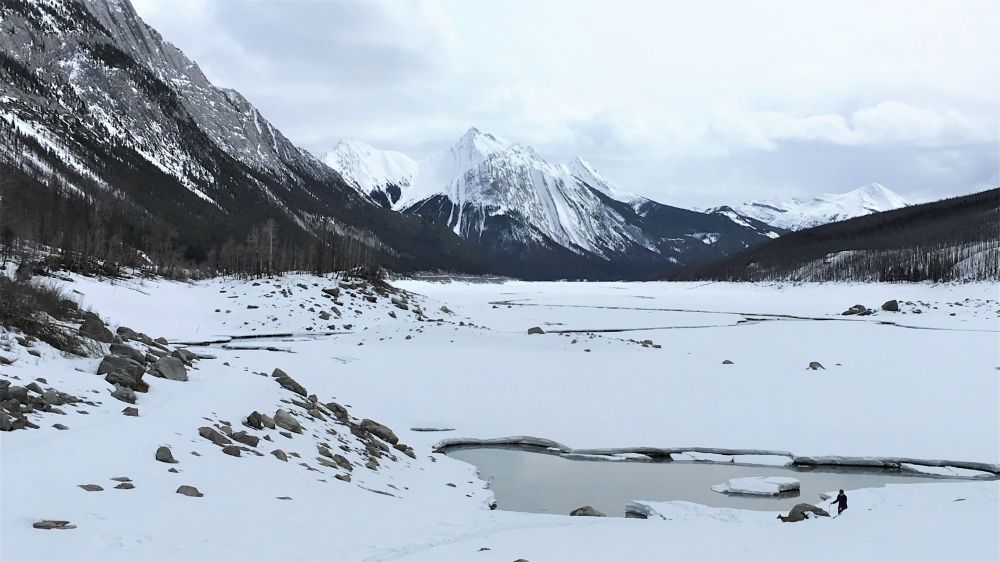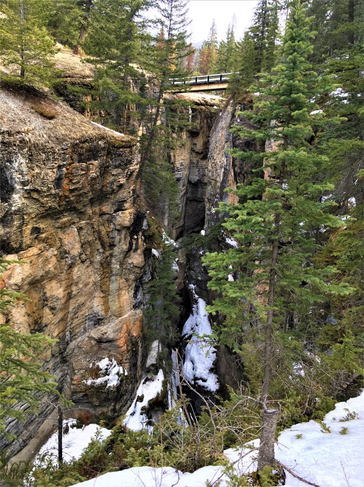 Jasper覆盖面积极大,一天的时间根本不可能游玩所有的地方,加之阿尔伯塔即使在四月,山里仍是冰天雪地,路面有时会很滑。抵达公园后,出于安全考虑,我们选择了沿玛琳公路南下观赏玛琳峡谷(Maligne Canyon)和药物湖(Meidcine Lake)。