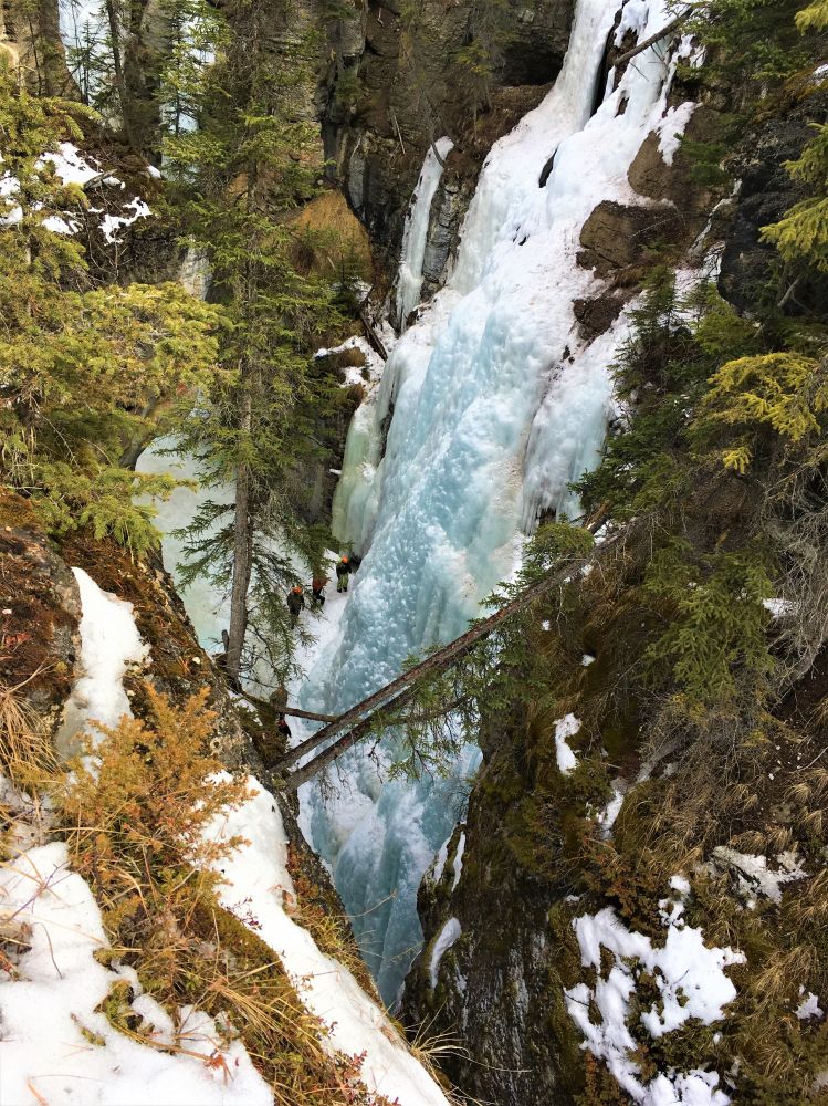 春季的Maligne Canyon与夏季截然不同,完全听不到轰然咆哮的水声,但偶尔可听到悦耳的鸟叫。狭窄的小径上覆盖着冰雪,路途显得陡滑和险峻。我们小心翼翼地扶着护栏或拾级而上或拾级而下,几十米之后巨大的冰川豁然出现在眼前。