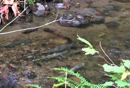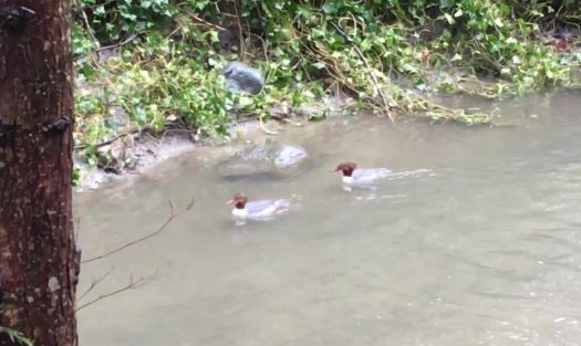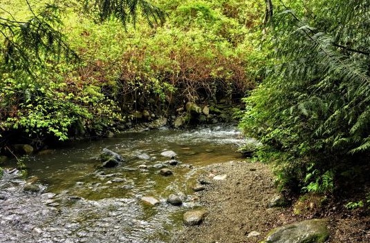 居民区的附近有一条小溪,小溪后面是一座山,山上有森林。因为每年一度的三文鱼洄游,靠着这条小溪的地带属于生态保护区。小溪旁有一条小径,供人们散步。小溪水流潺潺,清澈见底。水边,有一把长椅。