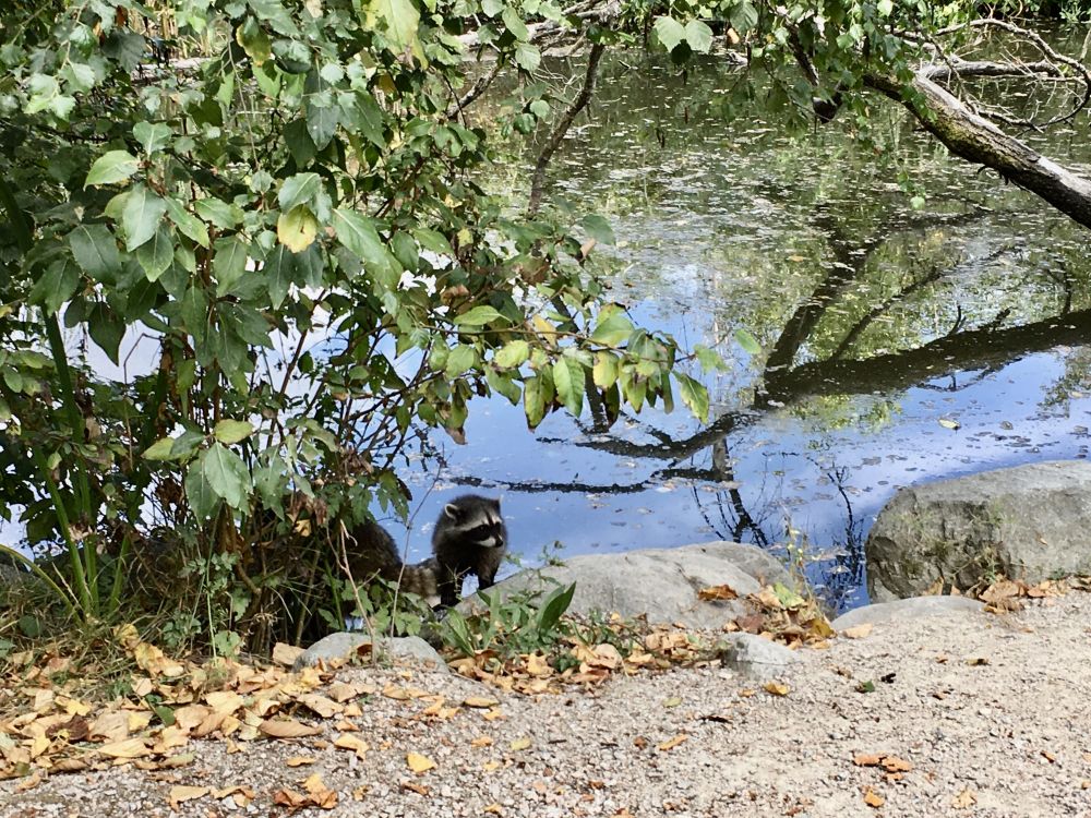 一只从树丛下探出身子的浣熊