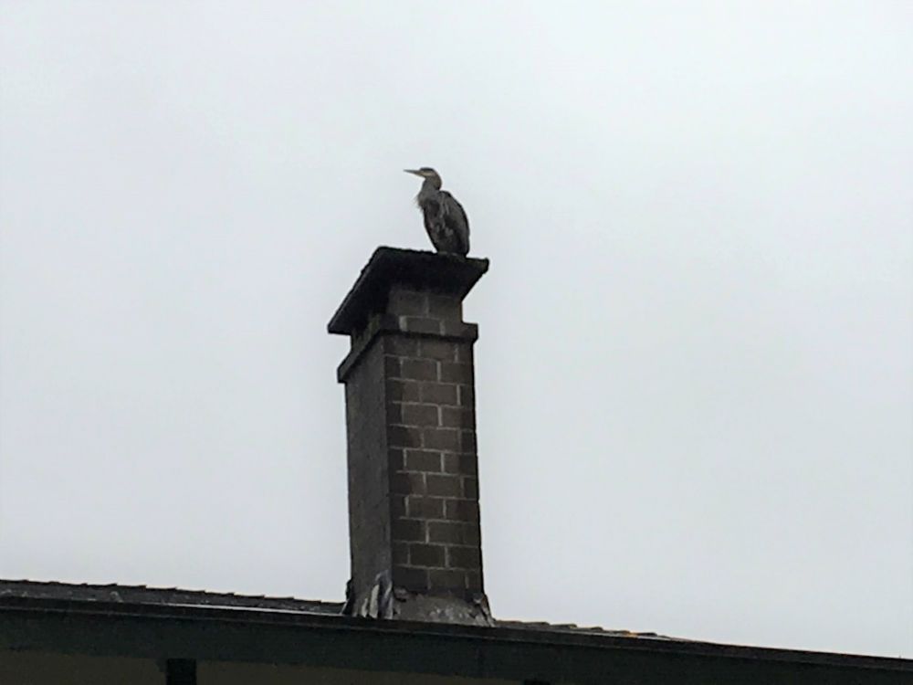 初冬阴雨天站在烟囱上的鹤,起初我以为是谁家的浪漫而在烟囱上立的雕塑,直到那只鹤开始梳理自己,我才意识到那是只真鹤