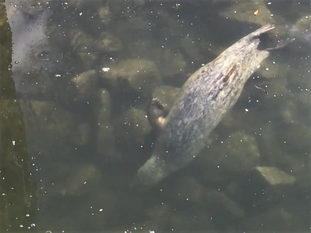 一只在离海岸边极近的海里抓鱼吃的大海豹