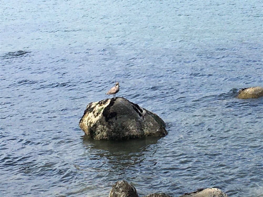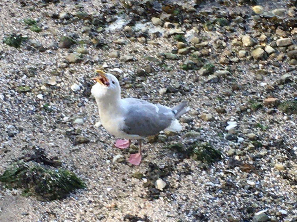 海岸边一只费力吞食大海星的海鸥。这只海鸥用尽其洪荒之力,花了很长时间才把巨大的海星完全吞进肚里。当时真担心它会被噎住。
