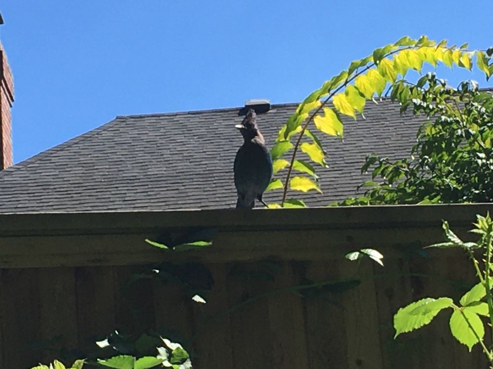 一只站在屋顶上享受阳光的蓝松鸦,可惜我的手机没能把它美丽的羽毛尽显出来