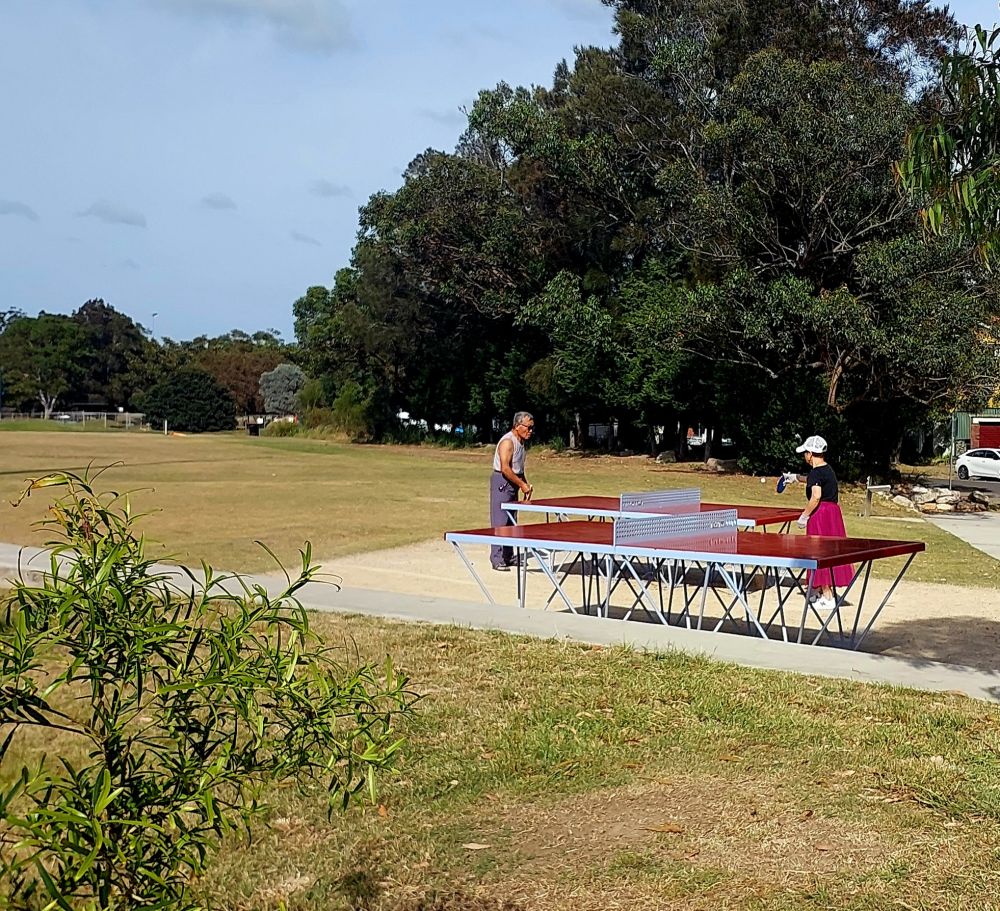 公园里玩户外乒乓球的华人老夫妇,见我照相,邀我上去打了几下,不是他们对手。