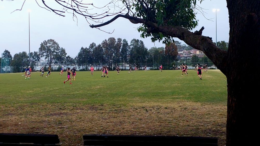 两队中西裔混合的青年男女,在海湾边细雨中玩澳洲特有的Oztag, 一种按照澳式橄榄球改良而来的温和得多的球类运动,用扯下对方球员系在腰上的红带代替激烈冲撞,非常适合男女和中西球员混玩,气氛友好热烈,有很多不分性别的社区俱乐部,越来越普遍,女儿也有自己的球队和每周比赛。