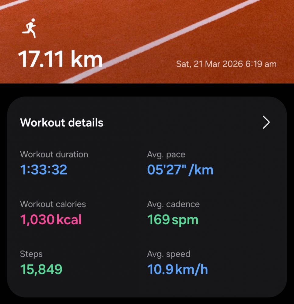 这个周末我有意试了下,周六17公里,休息一小时后,再加8公里健身慢跑;周日12公里。这17和12公里起步都很慢,第一公里竟然慢到7分配。