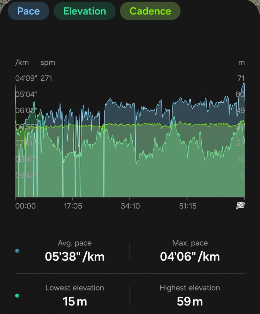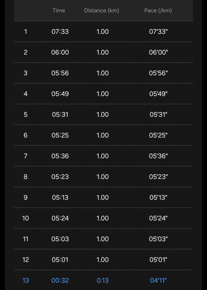 最后再回看一下以前一直抱怨的warm up太慢,五六公里后才进入状态。在筋膜炎大部痊愈后,我是故意试验了几天提高开头几公里的成绩,可以做到,但是不一定能获得能效最高的表现。我觉得起步时人既最迟钝,又最敏感,迟钝是当你那天体能状态较好,你会自不量力,一下跑得过猛,很快就消耗了大部分能量;敏感是当你体能不佳,各种因素都会出来闹事,从物理到心理,譬如工作忙,天气闷热,前晚和家人有些不愉快,等等,都会明显影响你的起步表现。