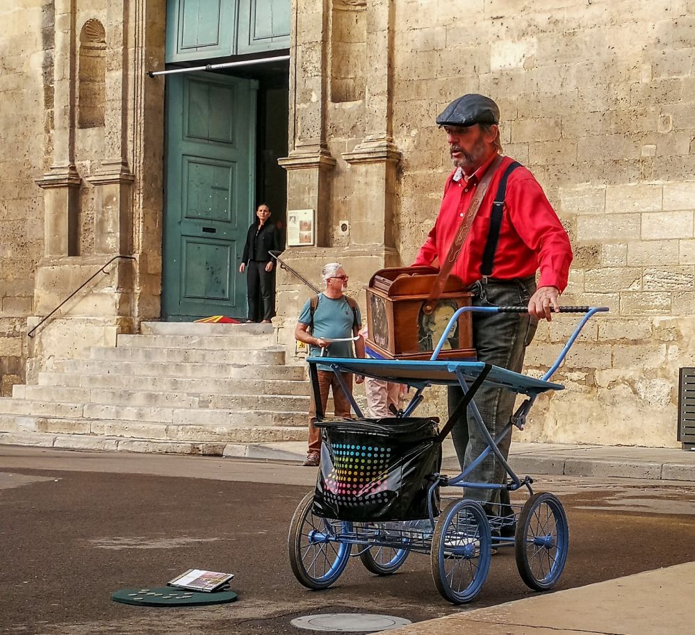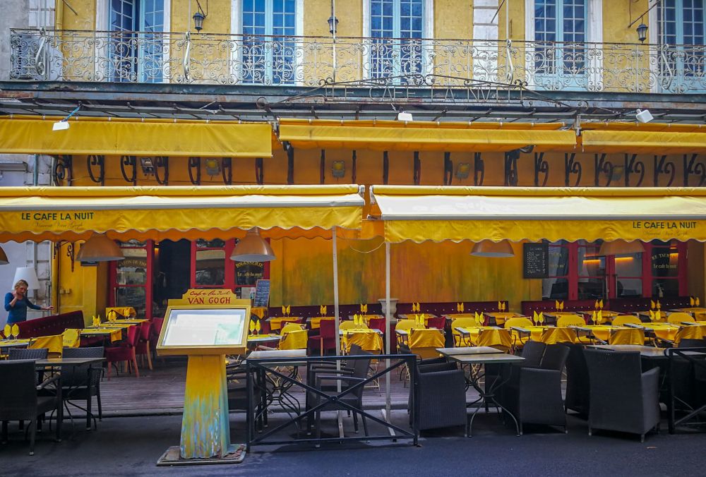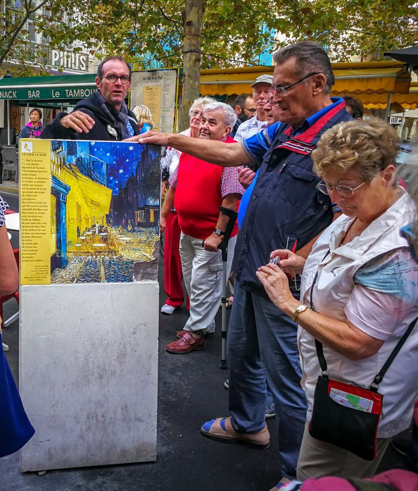 阿尔勒还有许多名人遗迹,这是一群欧洲游客正静默的怅望着梵高的《星空下的咖啡馆》。