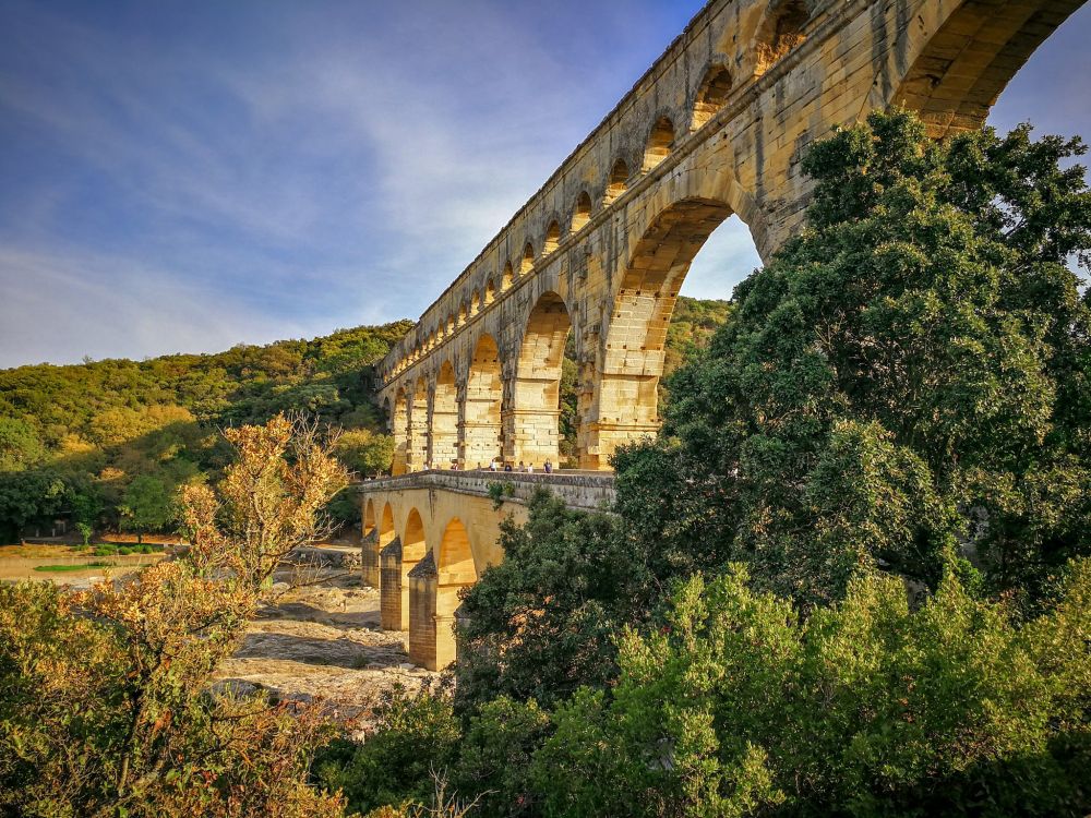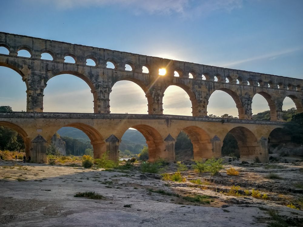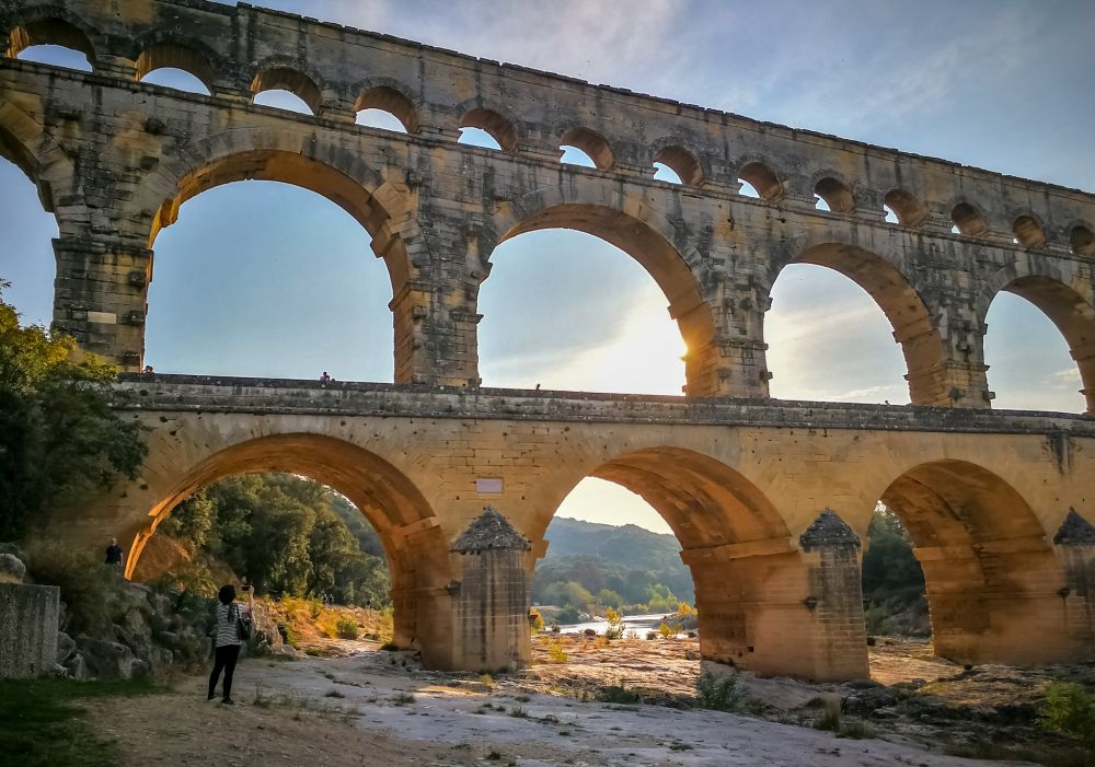 这是普罗旺斯的嘉德水道桥(Pont du Card),它是古罗马时代引水渠工程的一部分。今天,桥下的河水几乎干涸见底,桥的四周一片清冷寂静,然而这座两千年前的古迹,居然漂漂亮亮地映入我们的眼帘,一点也没有历史的沧桑感。