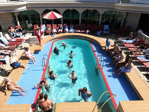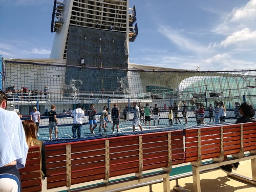 吃了午饭回房间休息,到两点多钟才动员了他们两个出去玩。泳池边上的躺椅上躺满了人,穿什么的都有,见到不少最难看的肥肉。泳池里总是很热闹,大屏幕上在演电影,泳池里的人都在仰着头看,躺椅上的人有看的有听的。我就在track上走步。走了一阵之后,我沿楼梯上了13楼,看冲浪教练教人学冲浪。真有一个人站在浪里很长时间,他能前后移动,还比较平衡。后来教练自己踩到浪上,那就是专业水准,他身体挺直脚下的板变换方向,扬起大片水花。冲浪场地的背后是排球场,正在进行着比赛,看上去水平不太高,大家玩得很高兴。乒乓球场地一直满员,老公和儿子在打checker,没一会儿就有两个中年妇女加入,他们分成两个队玩,后来又有几个年轻人要加入,老公和儿子就退出了。