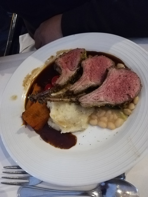 今天的晚餐要求正装,我们已经正装过一次了,没有什么困难。晚餐的菜谱里有羊排骨,儿子老公都点了这道菜。我因为中午的色拉吃得不舒服,儿子帮我点了一份锅贴,那个英文字俺还真不认识。今天的晚餐不同以往,先听得音乐响起,就餐的人们跟着音乐的节奏拍起手来,还有人摇起白色的餐巾。我们的座位恰好在楼梯的后面,前面的事情看不到,但是能看到四楼和五楼的人们和我们一起拍手摇餐巾。我看到四楼的服务员排着队随着音乐的节奏走着舞着,又有服务员在我们桌子背后的台阶上表演。临桌一家六个大人两个女孩和一个男孩子,这个一岁左右的小男孩脾气很不好,经常是因为他怒了,爸爸就得抱他出去。今天这么热烈愉快的气氛感染了他,坐在他的高椅子上手舞足蹈。我们家的两个男生正在手机上和别人玩国际象棋,他们仿佛什么都没听到。估计这个就是我们的告别晚宴了吧。