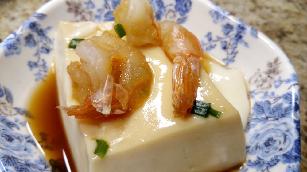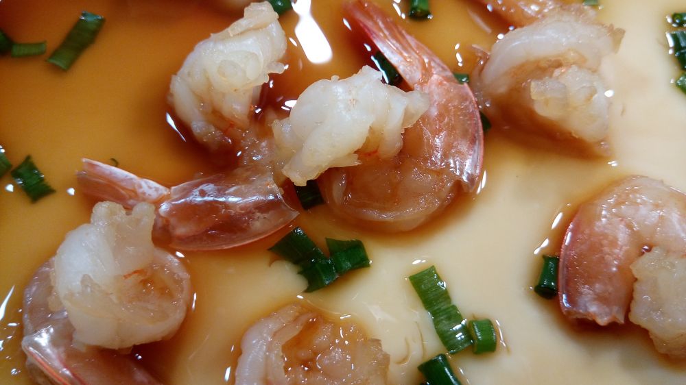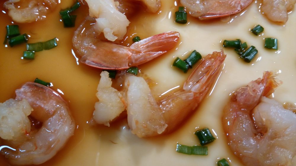 Recommended recipe: 4 eggs about 200g, boiled water 400ml, Stir them well with 1/4 tsp salt and 1 tbsp soy sauce. After Filtering, steam it for 5 minutes after the water is boiling, then turn off the fire and leave it for 10 minutes. Soy sauce (15ml soy sauce +15ml water) and shrimps were steamed also. Put shrimps, chopped green onions, soy sauce and sesame oil on the steamed egg.