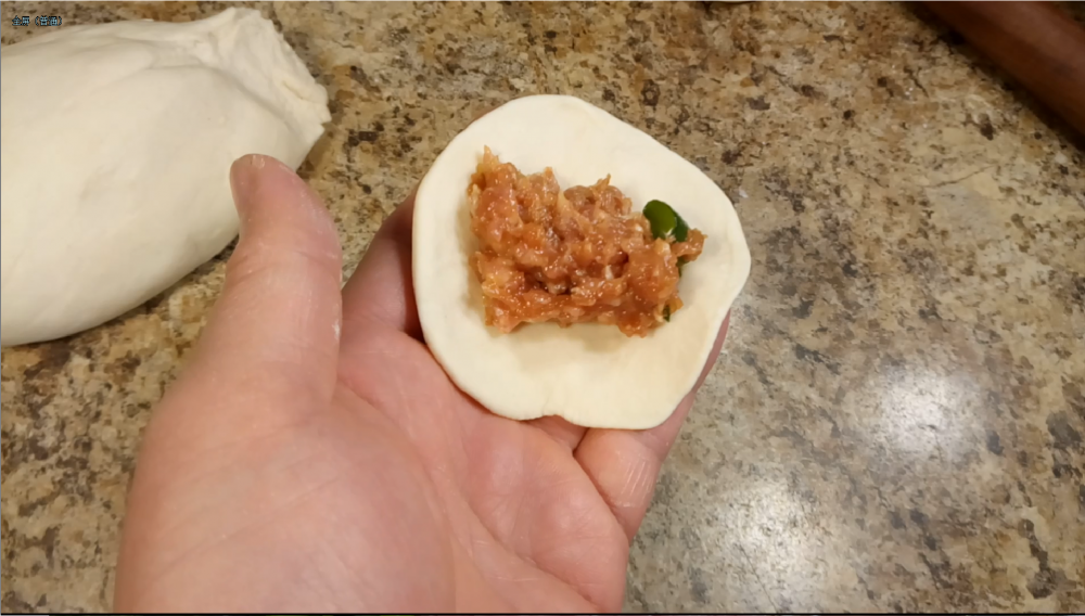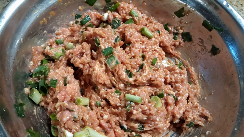 馅料:鲜肉馅550-600g,盐1平茶匙约6.5-7.0g、味精1/4平茶匙、生抽30-40ml、老抽5-10ml、五香粉1/2平茶匙、香油30-40ml、料酒30-40ml、姜粉1/2平茶匙、淀粉1汤匙、鸡蛋1个、温水150ml、青葱3根。将所有食材加在一起搅拌均匀。
