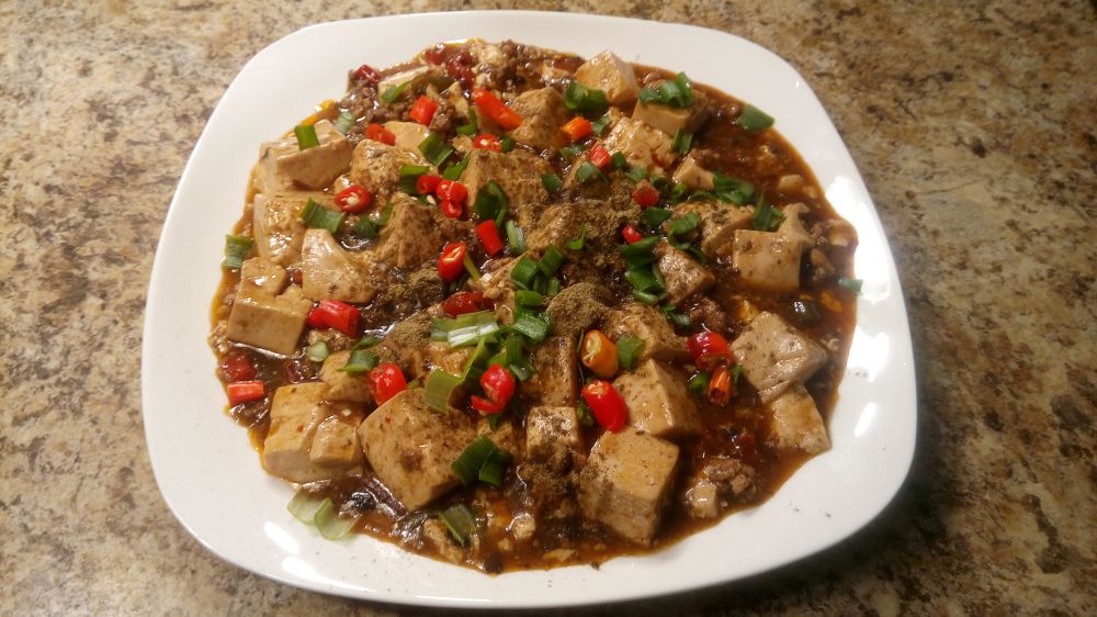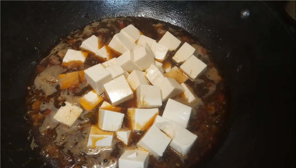 豆油+猪油中火烧热,放入5-10g花椒/泡椒、30-40g豆瓣/豆豉炒出红油,放入碎肉炒熟,加400-500ml水烧开,加入盐1/4-1/2平茶匙、生抽30-40ml,放入豆腐,水开后中小火煮5-8分钟入味,水淀粉30-40ml勾芡2次,收汁出锅,撒1/4-1/2平茶匙的熟花椒粉,再撒青葱和尖椒,拌匀后即可食用。
