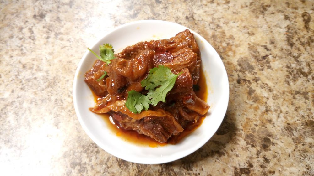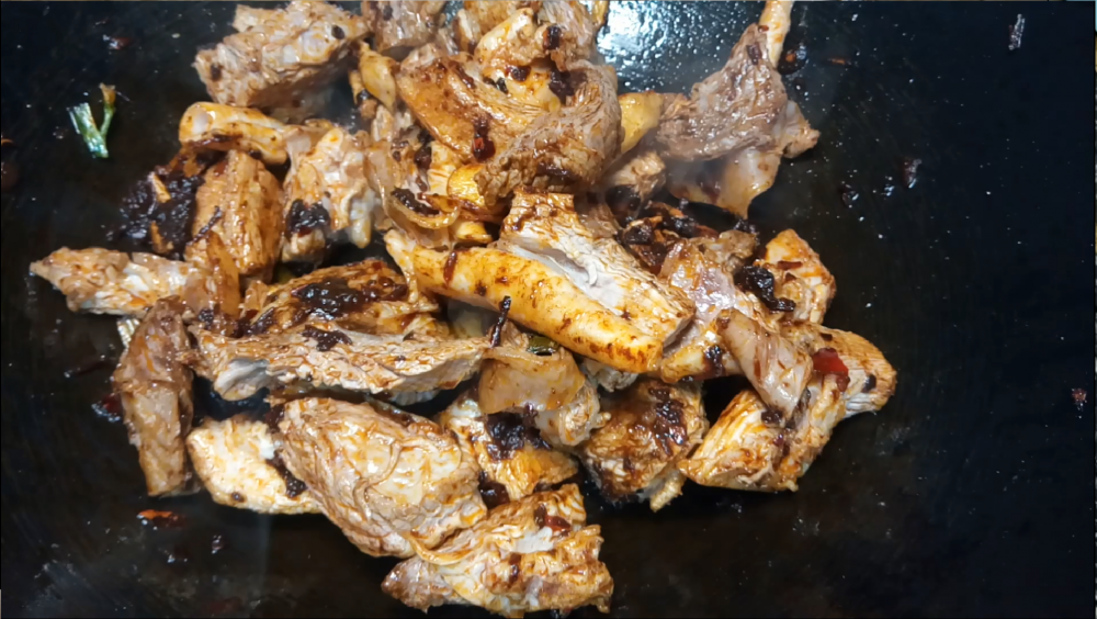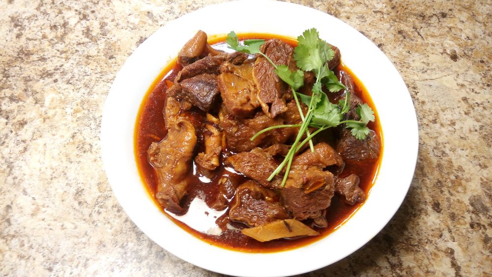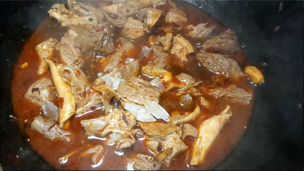 葱姜蒜各20-30g爆香,少量八角桂皮,加豆瓣酱50-60g炒出红油,放入牛肉炒2-3分钟,加糖色水,加冰糖5-10g、料酒30-40ml、基础盐量1茶匙约7g,高压锅炖35分钟后开盖,调味调色,大致是加盐1/2-1茶匙3-7g、味精1/4-1/2茶匙、生抽30ml,要根据具体情况调整。