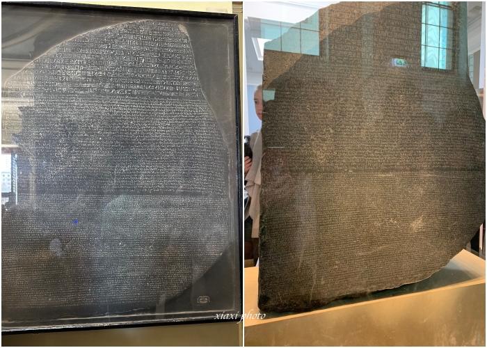 几年前我家去伦敦旅游时,在大英博物馆见到过罗塞塔石碑真品,见下图右(下图左是陈列在埃及博物馆中的罗塞塔石碑复制品):