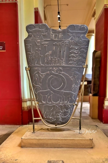 我在馆内寻找这块石板,花费了一些功夫。我应该和网友李子兄是前后脚(差一两个月)参观埃及博物馆的,可是我们拍的照片看起来不在同一位置。按说导游应该带我们观赏的,也许是当时一楼游客太多,遗漏了。我参观二楼下来后,注意到错过了纳尔迈调色板。先后问了好几个工作人员,都说应该在某处(可是不在那里)。总算有个工作人员说他今天在哪里看到过,随带我前往。我拍了几张照片,却没注意到它是双面的: