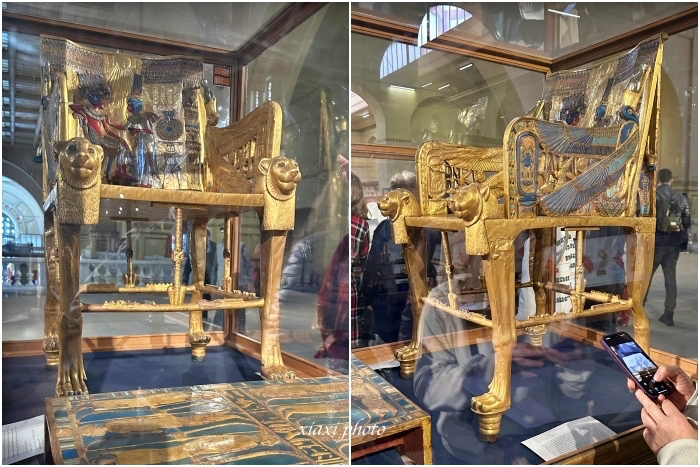 ↓↓ 下图是图坦卡蒙包金木座椅Golden Throne of Tutankhamun,镶嵌着宝石的木座椅显得金碧辉煌,被卡特认为是"迄今为止埃及出土的最美丽的文物"。