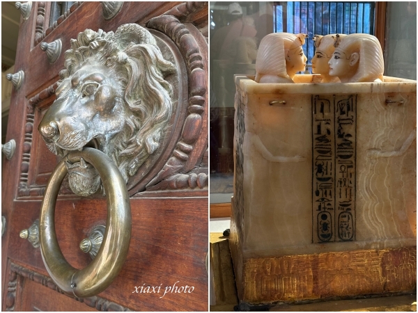 ↓↓ 下图左是博文馆大门上的门环;下图右是图坦卡蒙的内脏罐的雪花石膏箱 alabaster canopic chest of Pharaoh Tutankhamun.