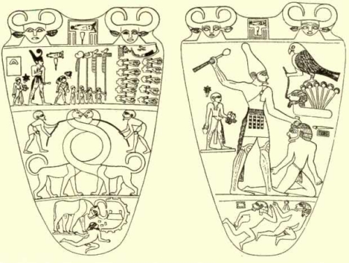 网上下载了一张图片,可以清楚看到纳尔迈调色板双面的图像:
