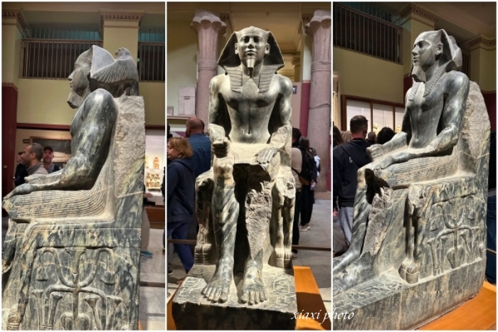 ↓↓卡夫拉坐像 (Statue of Khafre Enthroned),著名的古王国时期雪花石膏雕像,描绘了卡夫拉法老(Khafre,金字塔建造者之一)坐在宝座上。这尊坐像是古埃及早期雕塑艺术风格的典范之作。