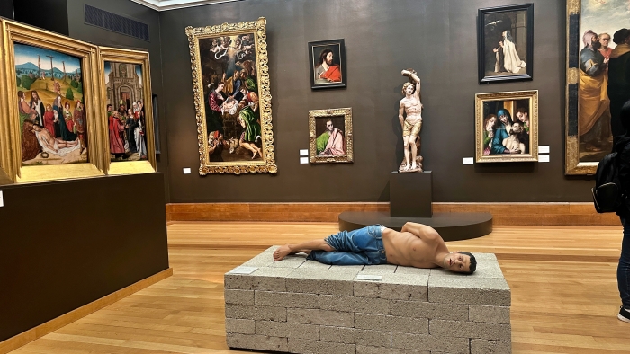 这是艺术家雷扎·阿拉梅什(Reza Aramesh)创作的超写实雕塑作品《行动125:伊拉克提克里特城,战俘》。 该雕塑由彩色椴木手工雕刻而成,并运用了油彩、石膏和玻璃眼珠。 作品描绘了一位来自伊拉克提克里特的战俘躺在石台上。 这个雕塑太逼真了: