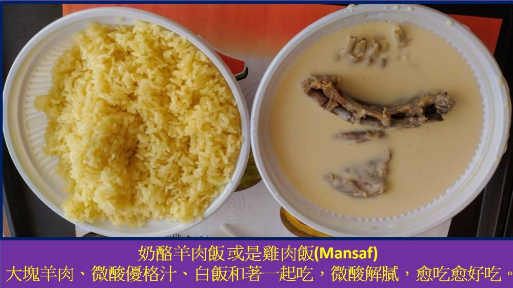 從死海回到安曼已過中午,小慶請司機帶去品嘗最具代表性的約旦美食,奶酪羊肉飯(Mansaf),大塊羊肉、微酸優格汁、白飯和著一起吃,微酸解膩,愈吃愈好吃。司機說以前婚宴主人會提供奶酪羊肉飯或奶酪雞肉飯(Mansaf)給賓客吃,六人一大鍋,動輒兩三百人一起吃,現在物價高已不再出現這種盛況了。下午遊安曼市區,司機說輪到他請小艾小慶吃當地最有名的甜點,Kunafa是起司上面有一層蜂蜜焦糖,好吃又特別。下午三點,小店門口空地已有很多人正在享用,來買的人絡繹不絕,司機說三點以後,排隊要排到馬路上呢!